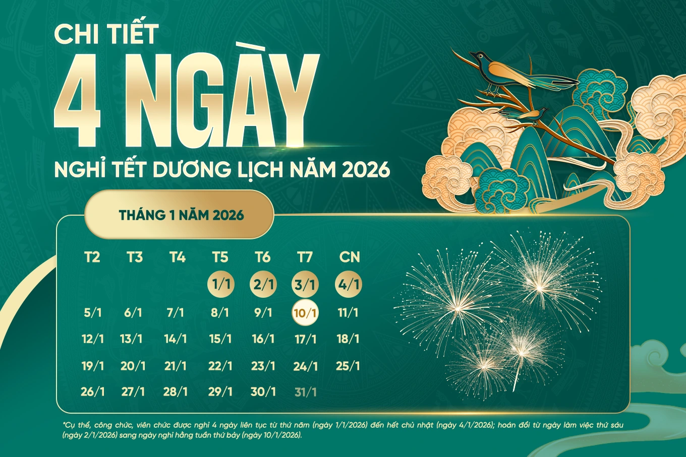 Cụ thể, công chức, viên chức được nghỉ 4 ngày liên tục từ thứ năm (ngày 1/1/2026) đến hết chủ nhật (ngày 4/1/2026); hoán đổi từ ngày làm việc thứ sáu (ngày 2/1/2026) sang ngày nghỉ hằng tuần thứ bảy (ngày 10/1/2026).