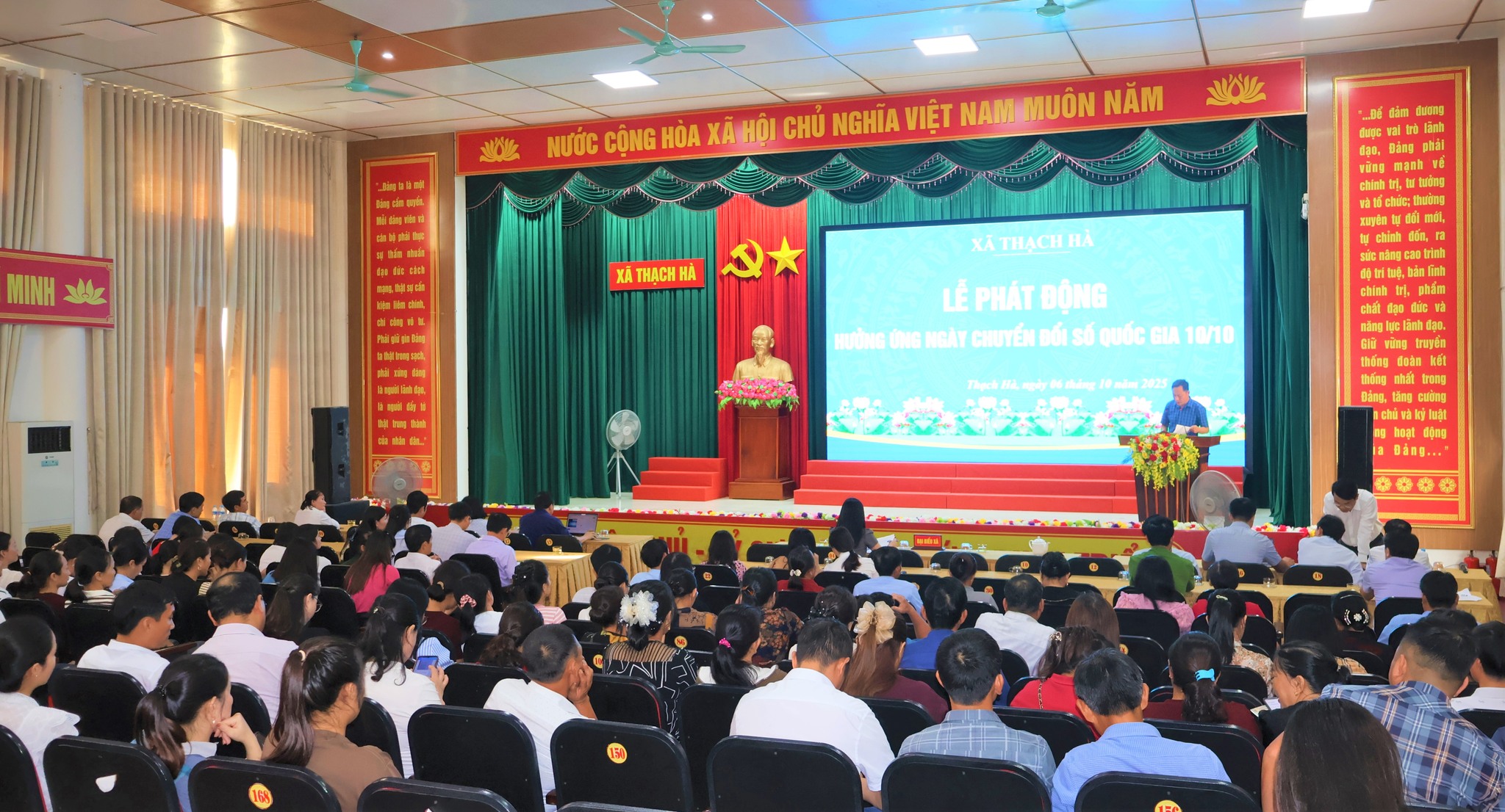 Tại buổi Lễ, xã Thạch Hà đã phát động hưởng ứng ngày chuyển đổi số quốc gia năm 2025 với chủ đề chuyển đổi số nhanh hơn, hiệu quả hơn, gần dân hơn. Theo đó, từ ngày 10/10/2025 đến ngày 25/10/2025 xã Thạch Hà triển khai chiến dịch truyền thông, hướng dẫn người dân nâng cao kiến thức, kỹ năng, ứng dụng các dịch vụ số trên nhiều lĩnh vực theo phương châm “ Đi từng ngõ, gõ từng nhà, hướng dẫn từng người dân".