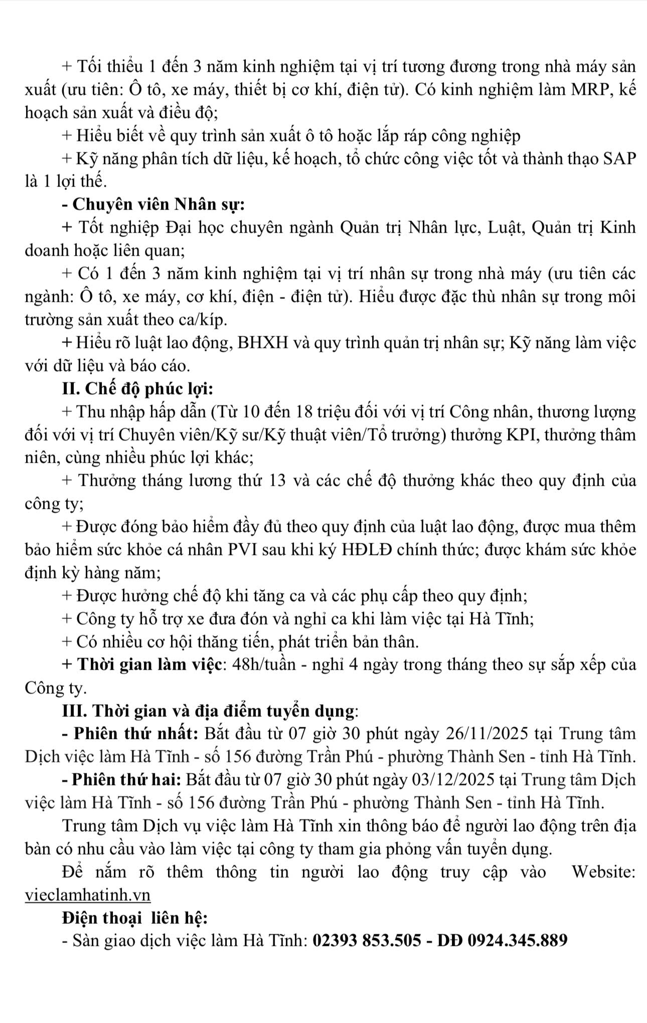Thông báo tuyển dụng cho lao động làm việc tại Nhà máy Sản xuất ô tô VinFast Hà Tĩnh
