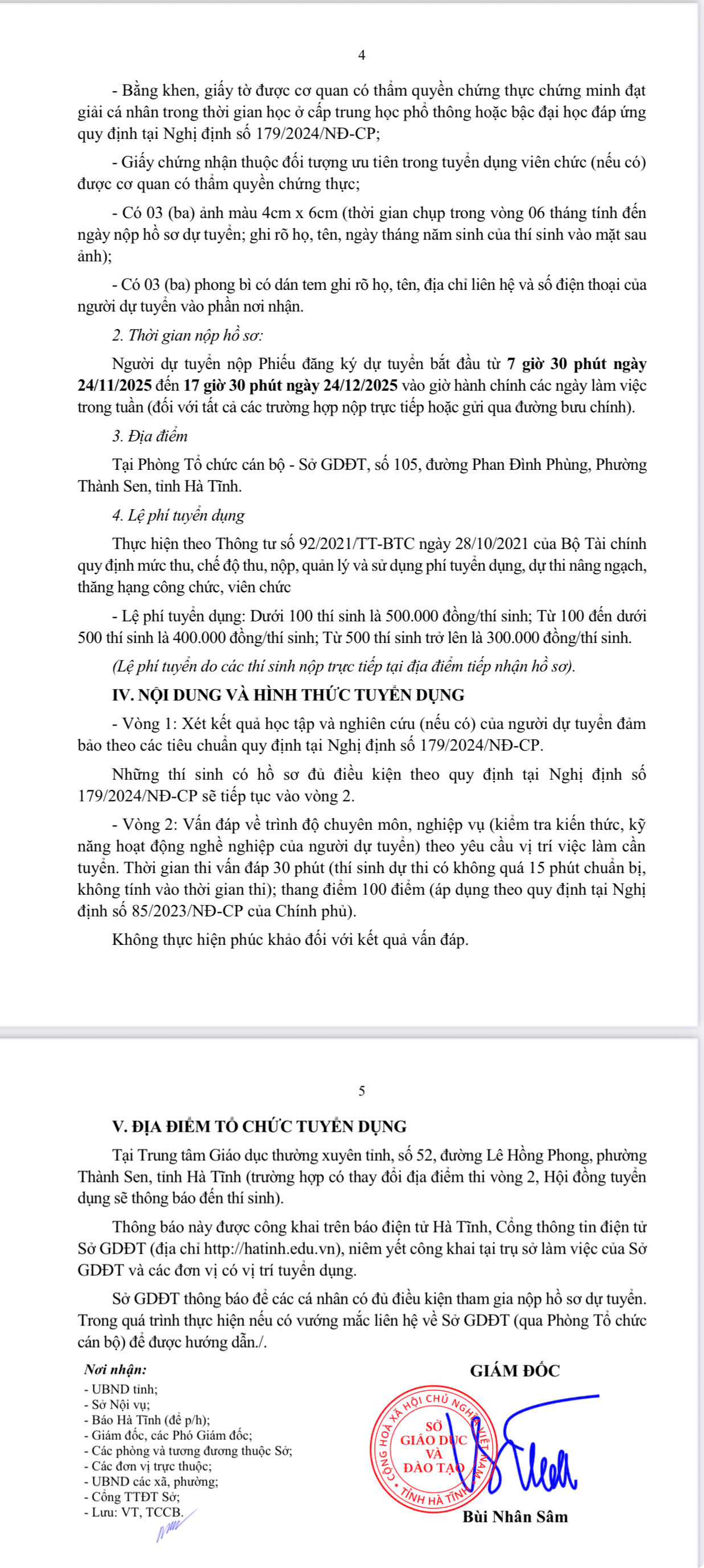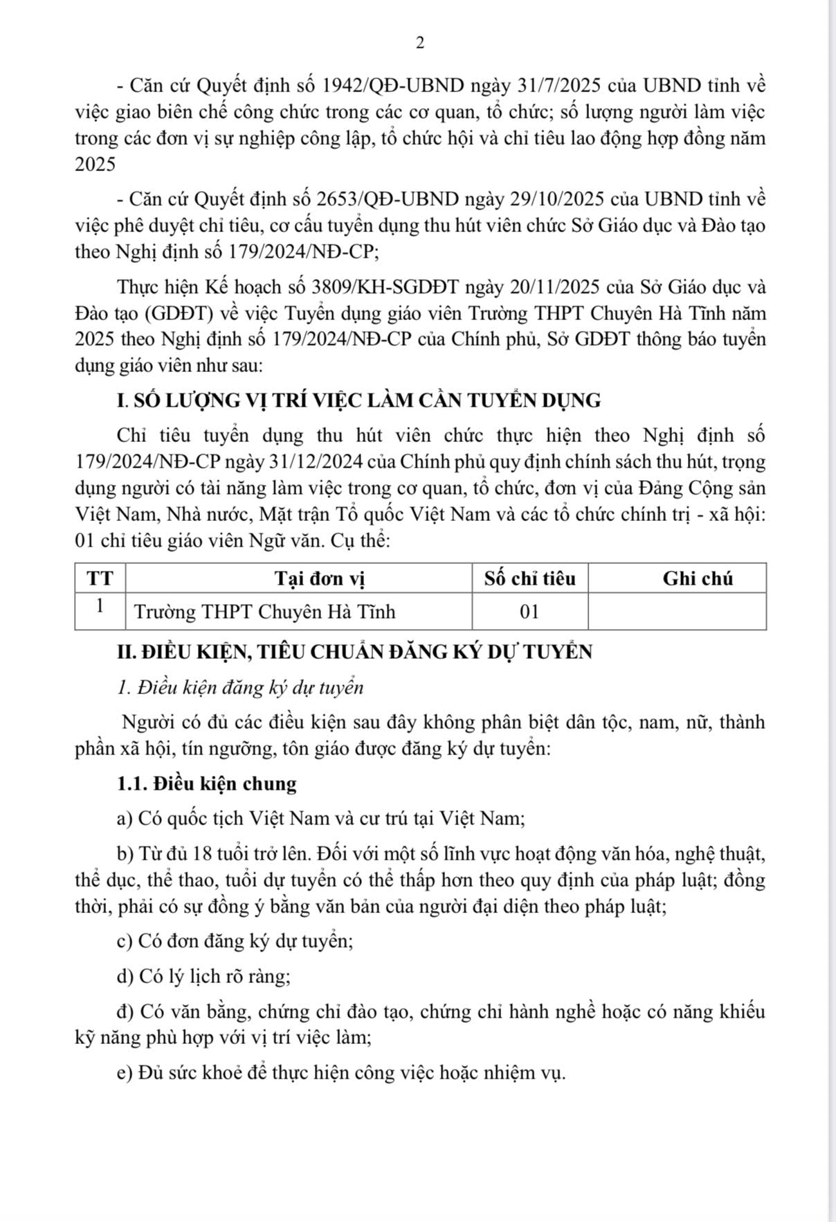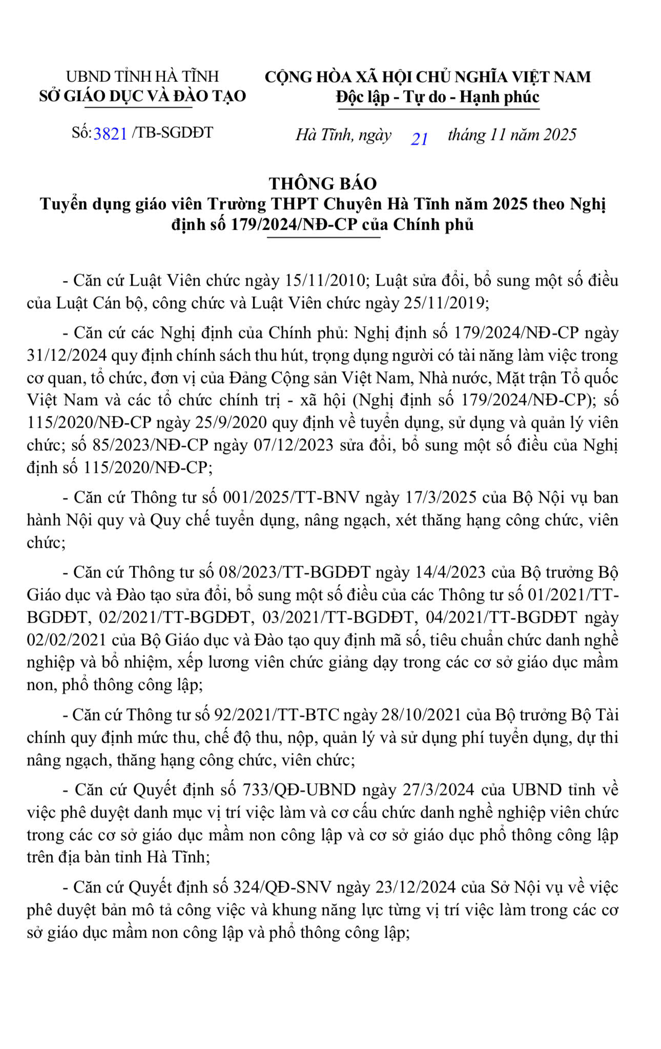 Trường THPT Chuyên Hà Tĩnh thông báo tuyển dụng giáo viên năm 2025Tường Vy - Phòng Văn hoá Xã Hội24/11/2025A -A+Tường Vy - Phòng Văn hoá Xã Hội24/11/2025A -A+Trường THTP Chuyên Hà Tĩnh thông báo tuyển dụng giáo viên năm 2025 theo Nghị định 179//2024/NĐ-CP của Chính phủ File đính kèmThong-bao-tuyen-dung-giao-vien-179_lehoainamsgd-21-11-2025_10h50p19(21.11.2025_14h37p50)_signed.pdf