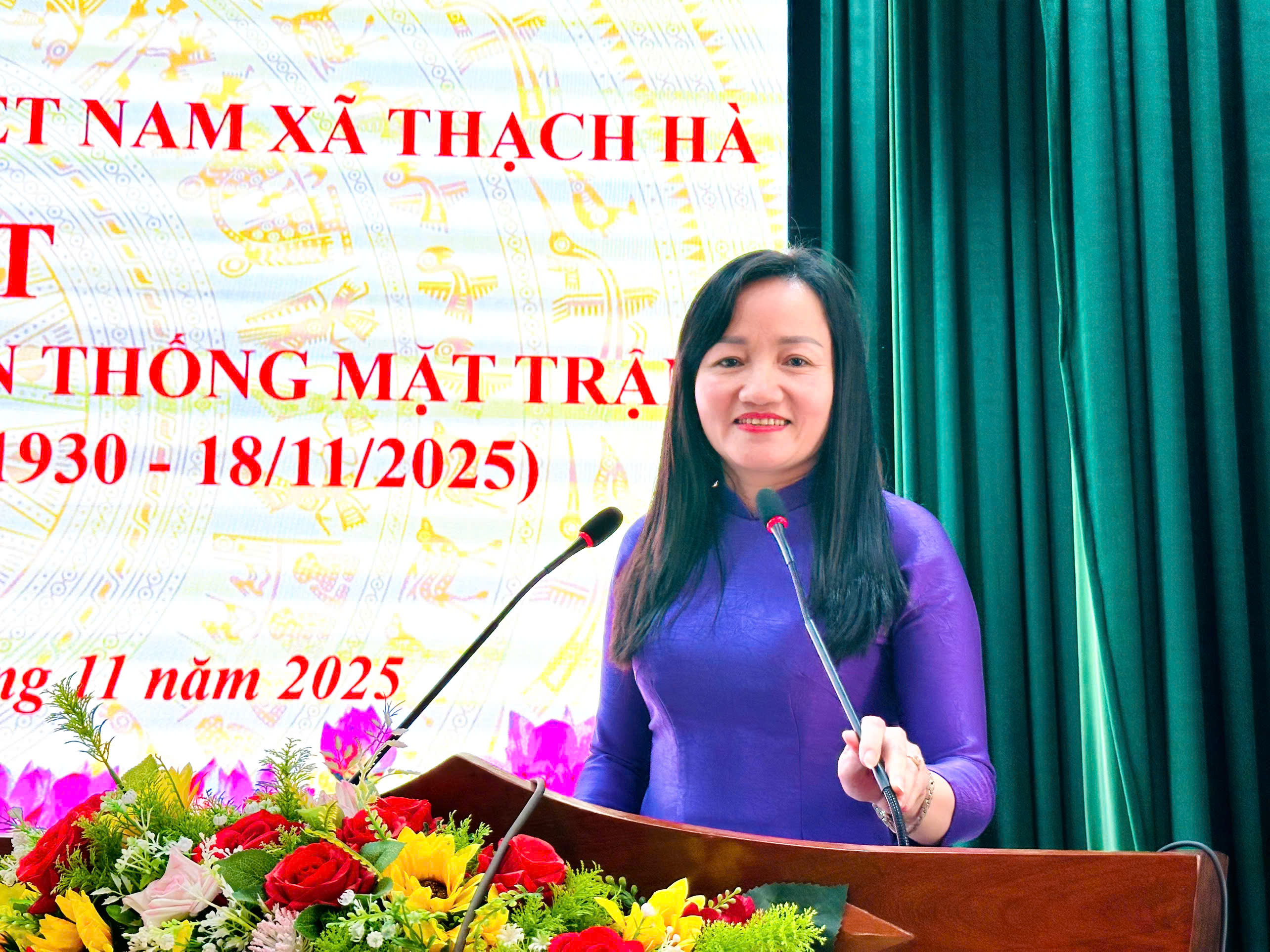 Phát biểu tại buổi gặp mặt, đồng chí Bùi Thị Xuân - Phó BT TT Đảng uỷ xã ghi nhận và biểu dương những kết quả đạt được của Mặt trận xã trong thời gian qua, đồng thời kêu gọi toàn thể cán bộ, đảng viên và nhân dân tiếp tục phát huy tinh thần đoàn kết, nêu cao trách nhiệm công dân, chung sức xây dựng quê hương Thạch Hà ngày càng giàu đẹp, văn minh.
