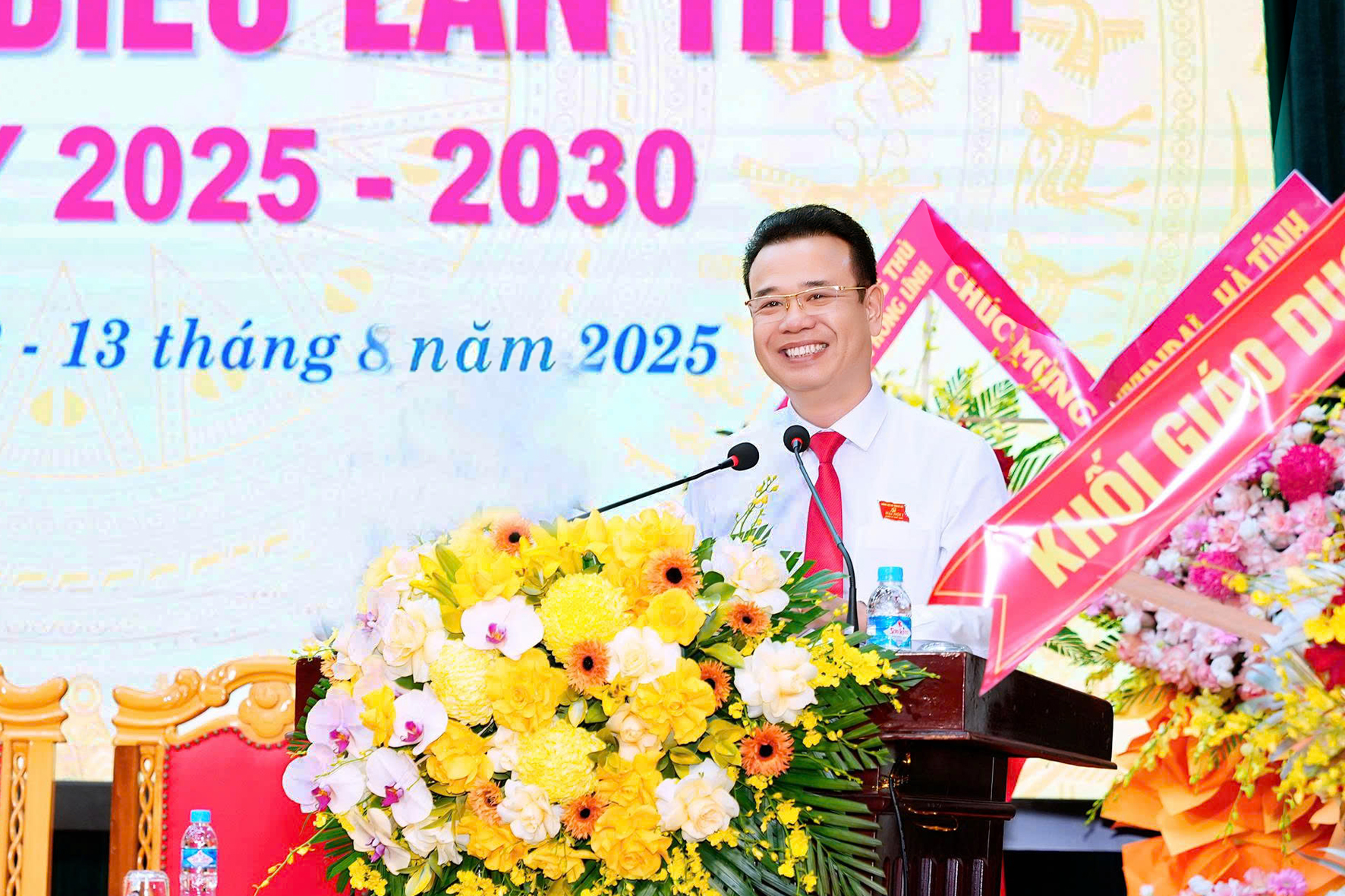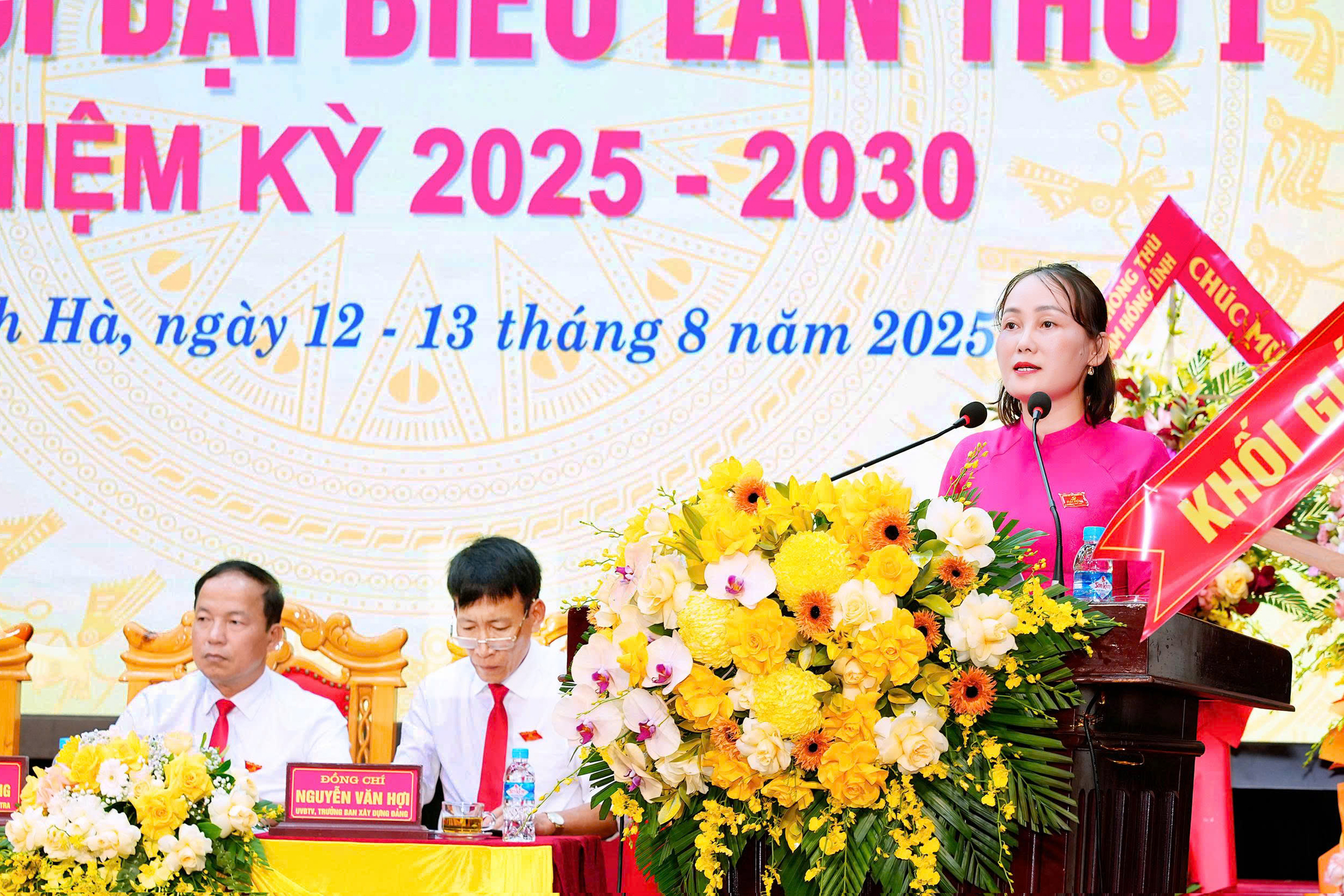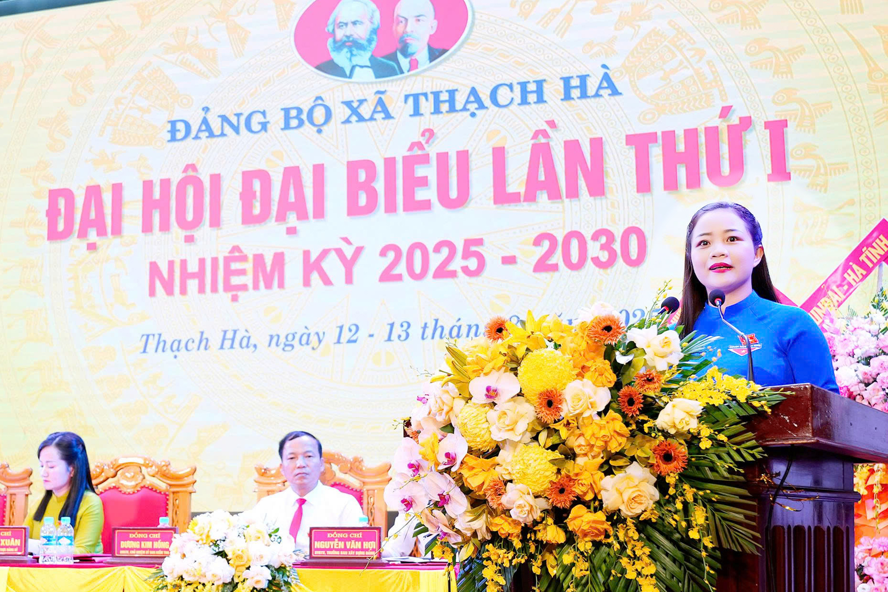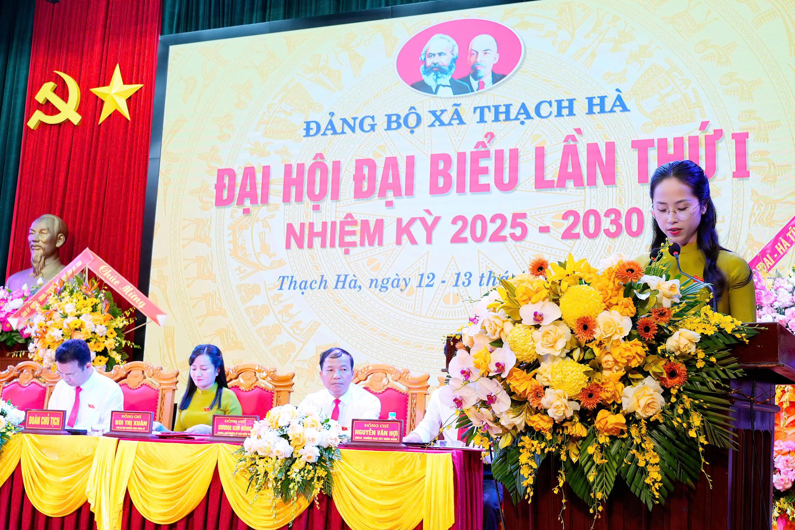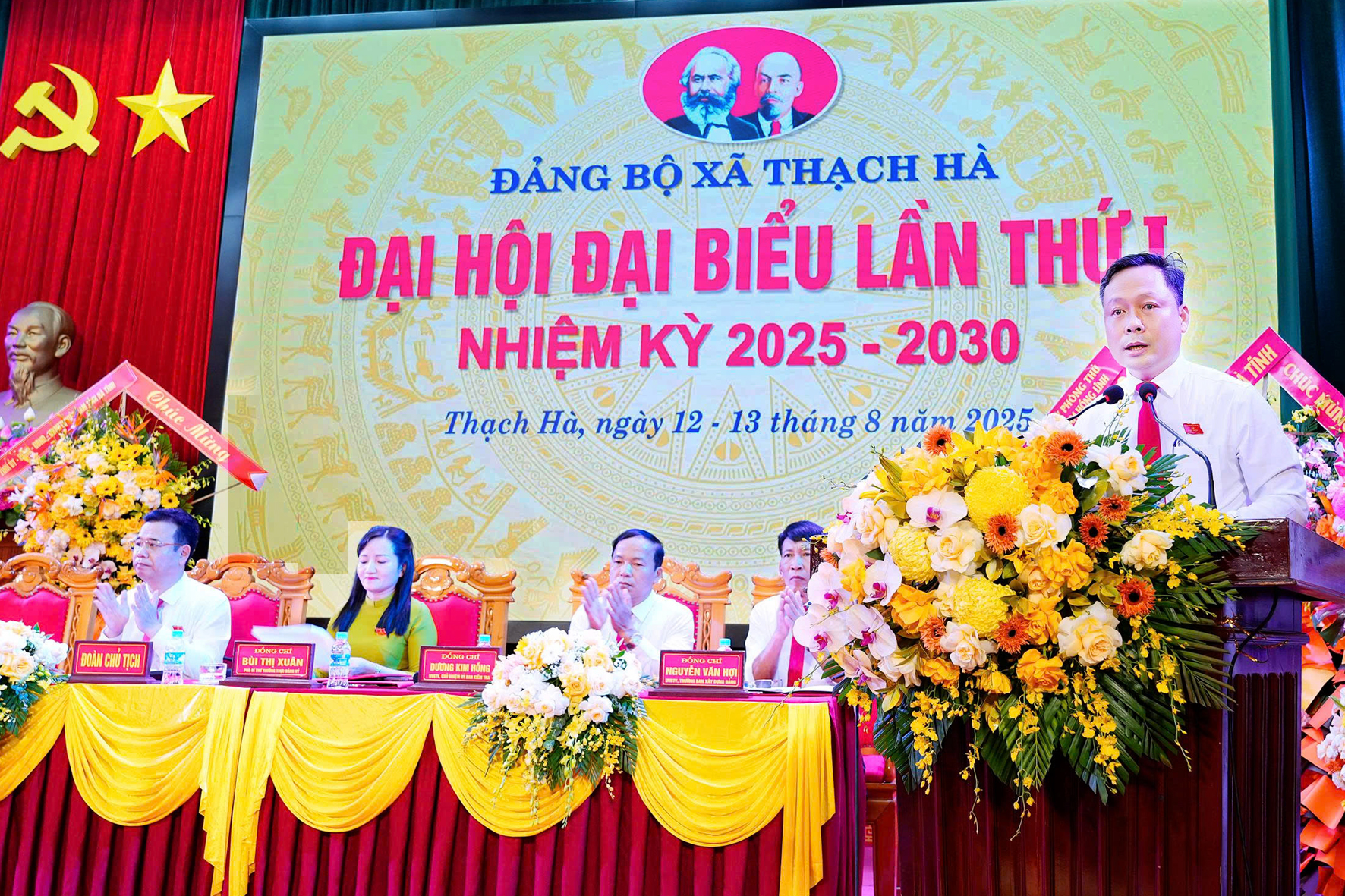 Đồng chí Bí thư Tỉnh ủy Nguyễn Duy Lâm cùng các đồng chí lãnh đạo tỉnh tặng hoa chúc mừng Ban chấp hành Đảng bộ xã Thạch Hà nhiệm kỳ 2025-2030.